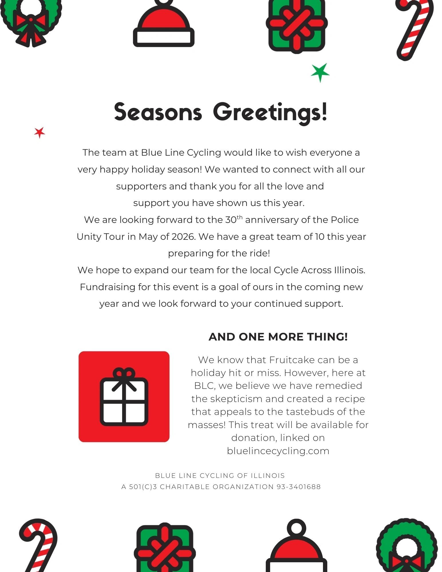 Make a difference today with a secure donation to support a rider. Blue Line Cycling of Illinois is a non-profit organization under section 501c(3) of the Internal Revenue code, therefore, donations made to Blue Line Cycling of Illinois are fully tax deductible.